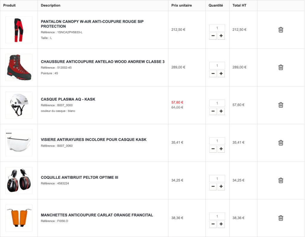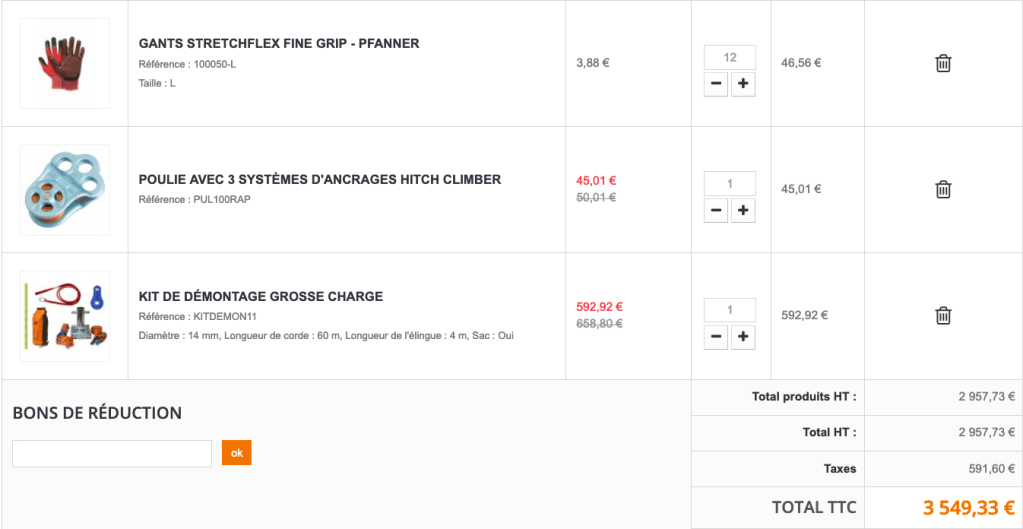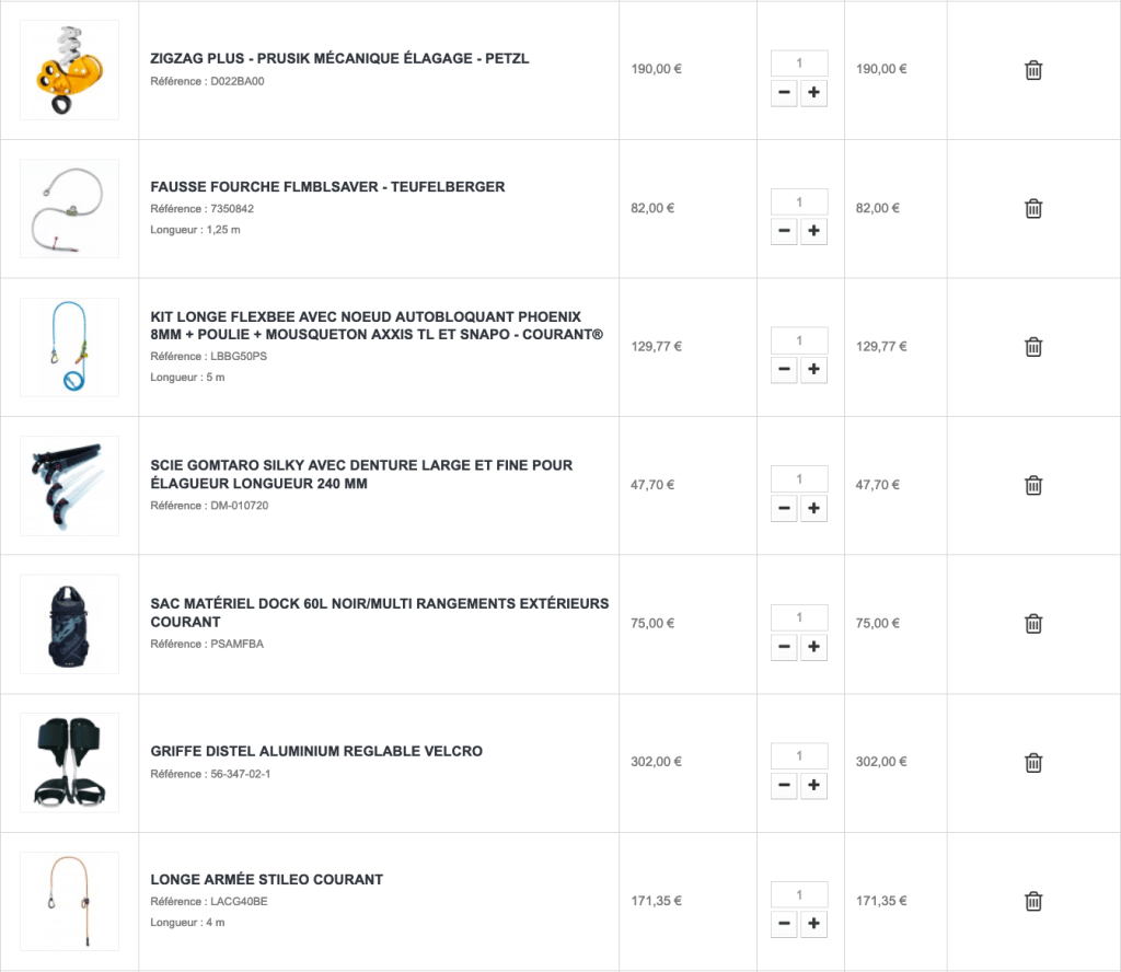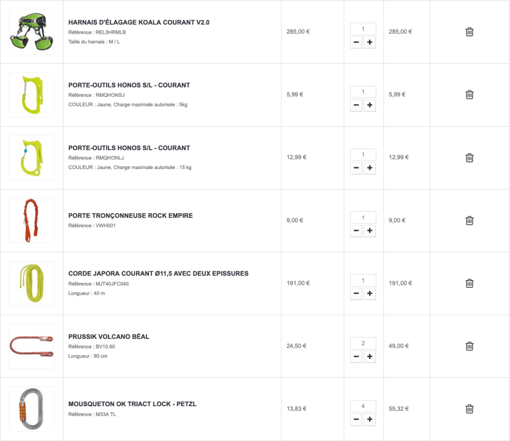 Un exemple avec le site de l’équipeur d’une commande d’un équipement complet pour un arboriste grimpeur.