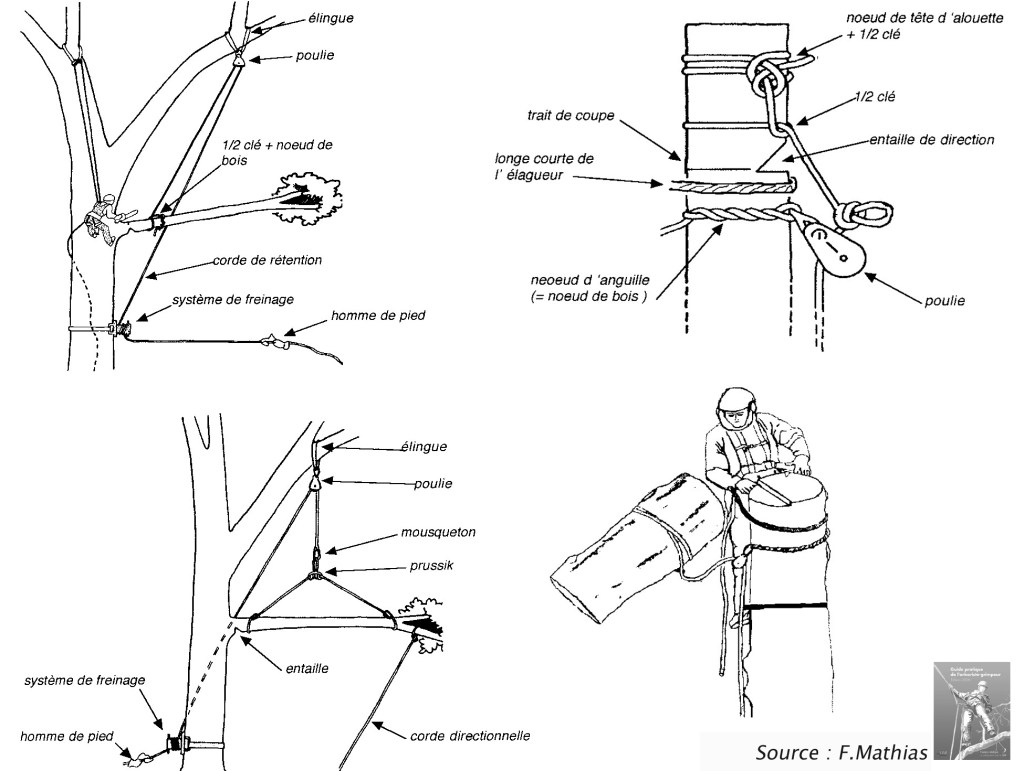 - Installation de l’élingue et de la poulie sur le fut à l’endroit ou l’on souhaite couper