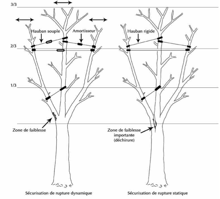 L’haubanage dynamique : plutôt réservé au jeunes arbres, il a pour ambition de solliciter de la part de l’arbre un bois de réaction (tension ou compression). Il est temporaire.