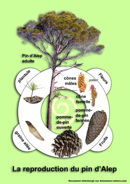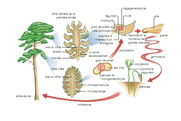(…) Les pins sont des gymnospermes, ce qui signifie qu’ils n’ont au sens strict ni fleur, ni fruit, au contraire des angiospermes comme le pommier ou le chêne. La différence fondamentale entre les fleurs véritables de ces derniers et les fausses fleurs des gymnospermes est la présence chez les premières d’une enveloppe (le carpelle) autour des ovules qui se transforme après la fécondation en fruit.