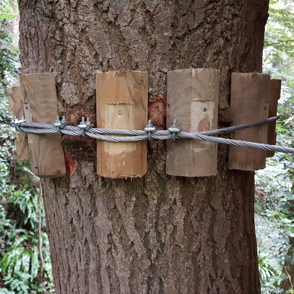 Afin de ne pas endommager le rhytidome avec les frottements, l’usage veut que l’on positionne des buchettes entre l’écorce et le câble avant de serrer les boulons.