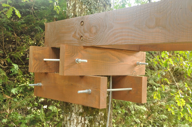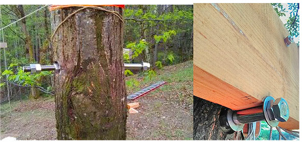Dans la théorie, pour que l’arbre soit le moins impacté possible et que l’installation puisse durer, il est nécessaire de desserrer les boulons au milieu de l’été (le plus possible sans faire tomber l’ouvrage) et venir les resserrer au milieu de l’hiver.