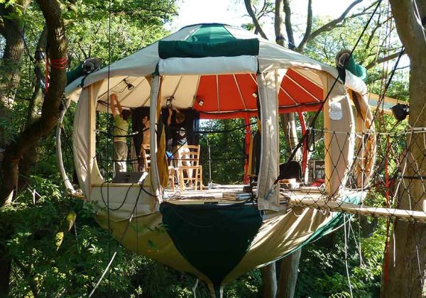Le principe du pilotis est de permettre de donner le sentiment d’une cabane dans un arbre alors que techniquement, on ne vient que l’intégrer à celui ci. Du plancher au toit en passant par les escalier, on ne touche pas physiquement l’arbre.