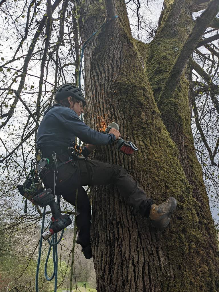 Sur l’aspect physiologique et sanitaire, l’arbre peut tout à fait absorber un corps étranger sans que cela nuise à son fonctionnement ou le tue, la compartimentation (CODIT) est quelque chose qu’il sait plutôt bien faire. Le perçage est donc une solution moins nuisible que le serrage et le cerclage.